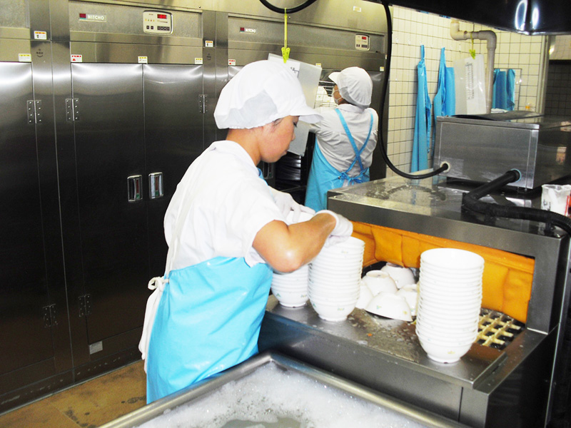 調理された給食を各クラス毎に分け、指定された場所にて先生に渡します。食事の終わった食器、食缶等の洗浄、給食室の清掃等を行ってもらいます。時には、野菜類の切り物を行ってもらいます。